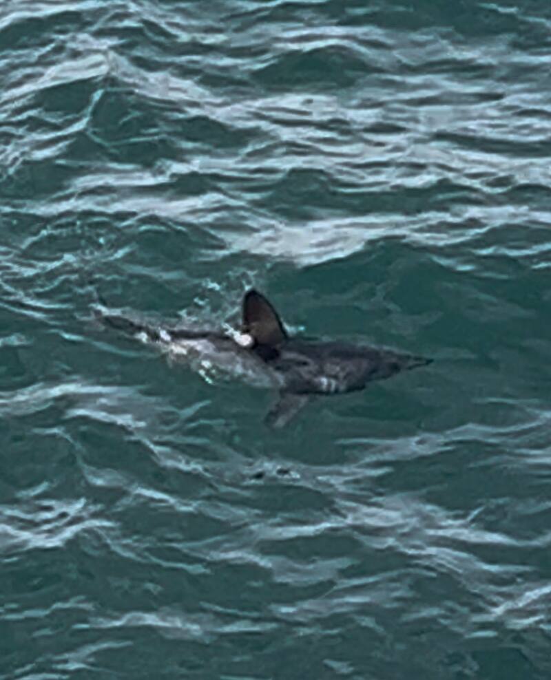 El escualo en cuestión —según captó Joaquín en vídeos— dejó ver su oscura aleta dorsal, nadando sin apuro, remando su aleta caudal de un lado a otro, muy cerca de un roquerío, y en un avance en semicírculo.