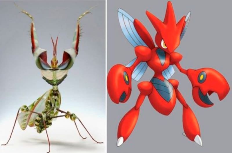 La única diferencia entre la evolución de Scyther y el insecto es su color: mientras que el del mundo Pokemon es rojo, el de la vida real es verde. Sin embargo su anatomía y sus movimientos de pelea (brazos en alto y cuerpo erguido) los asemeja a ambos.
