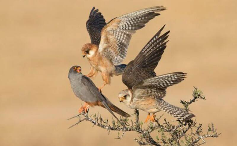 Amir Ben-Dov obtuvo el primer lugar en la categoría “Aves”. El fotógrafo israelí pasó cinco días tomando fotografías de estos cernícalos de patas rojas. (Foto: Amir Ben-Dov/WPY2015)