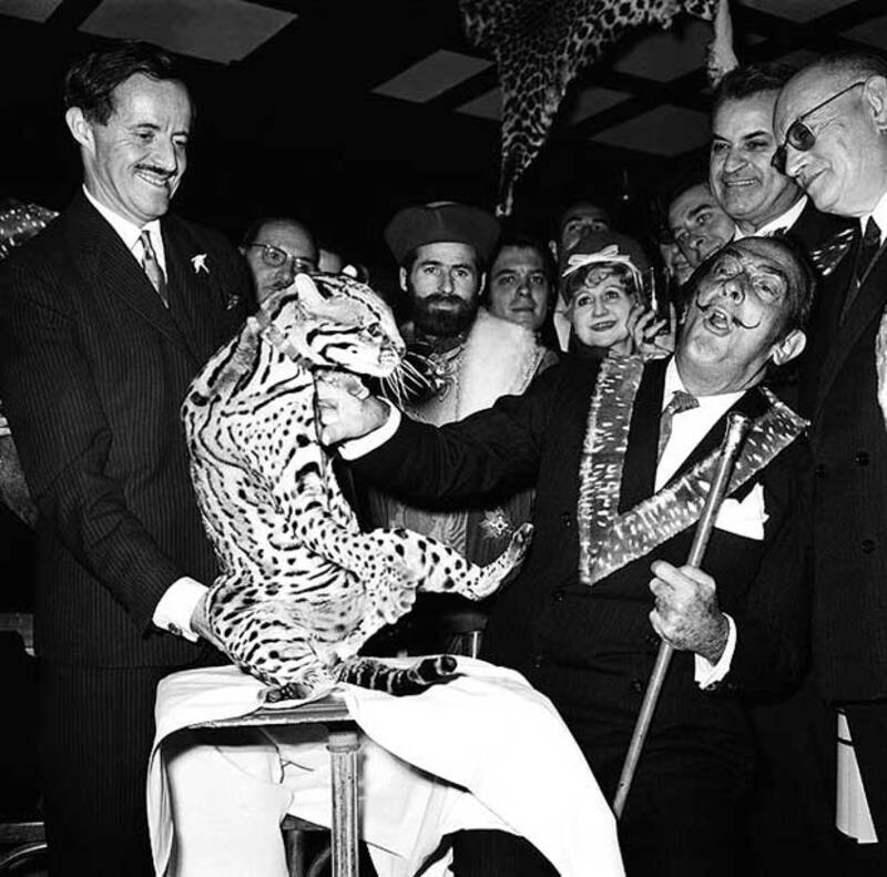 El pintor surrealista español Salvador Dalí con su ocelote Babou.