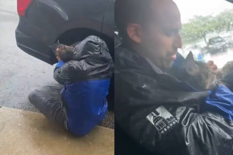 El animal se encontraba estresado, desorientado y empapado debajo del auto de estos comunicadores. Es por esto que el hombre se agachó, sin importar mojarse, y lo recogió para llevarlo dentro de su medio de transporte.