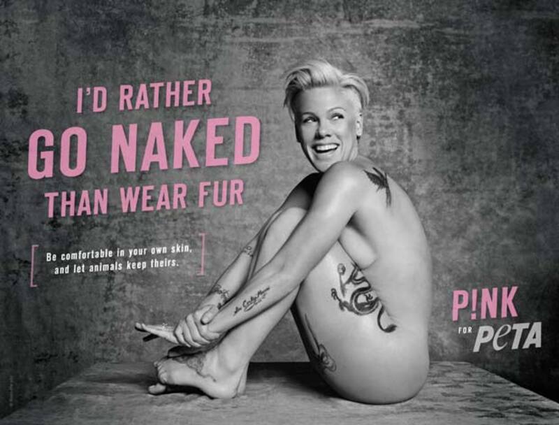 Su deseo de que los animales conserven sus pieles y que los humanos dejen de torturalos y asesinarlos para fabricar suntuosos abrigos, manifestó la cantante Pink, quien tomó parte en una sesión fotográfica, completamente desnuda, para apoyar el trabajo de los voluntarios de la agrupación "Personas por un trato ético de los animales" (PETA, por su nombre en inglés).