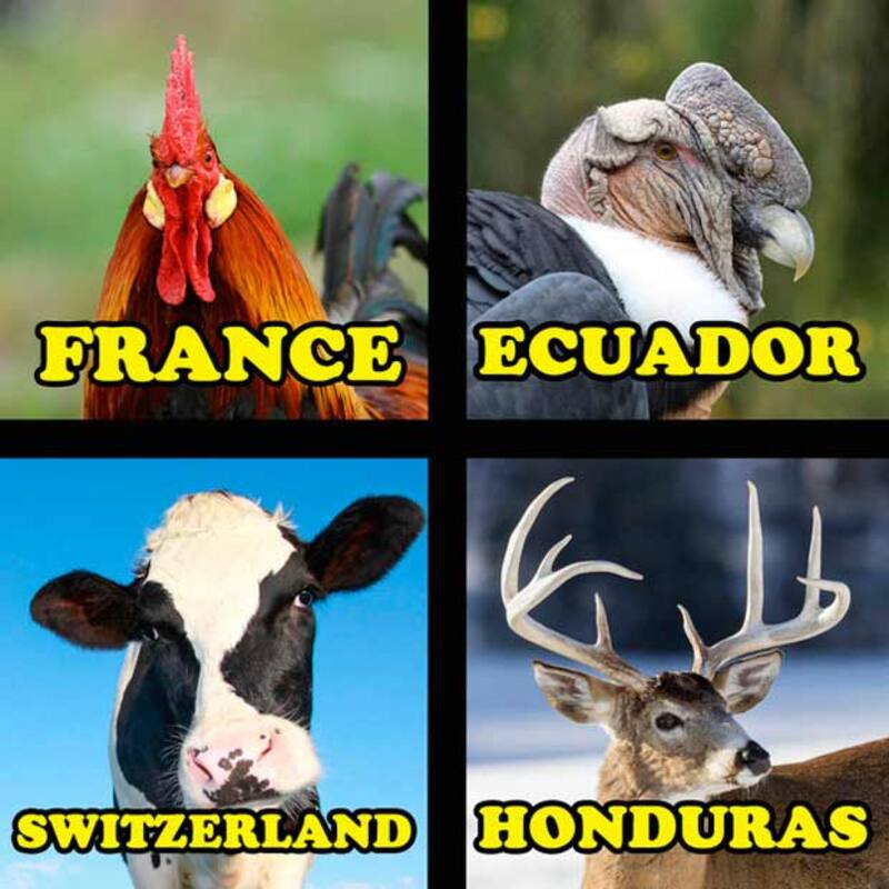 El gallo francés y el cóndor andino de Ecuador picotean y se comen con papas fritas al Venado cola blanca de Honduras y a la vaca de Suiza.