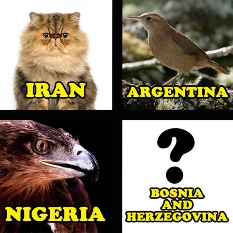 Al igual que con Camerún, Bosnia y Herzegovina es descalificado por no tener un animal nacional. Así, el águila de Nigeria le da el bajo al gato persa de Irán y el hornero rufo de Argentina pasa colado.