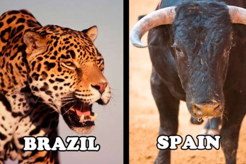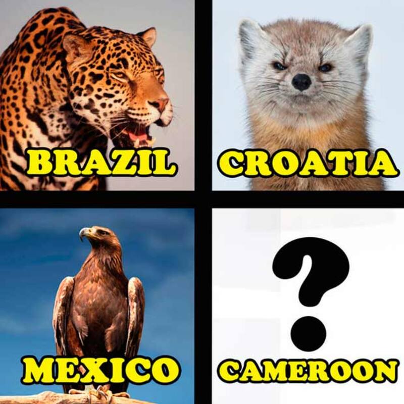 Camerún queda elIminado altiro porque no tiene un animal nacional. Aunque es linda, la marta de Croacia no es rival para el jaguar de Brasil y el águila dorada de México.