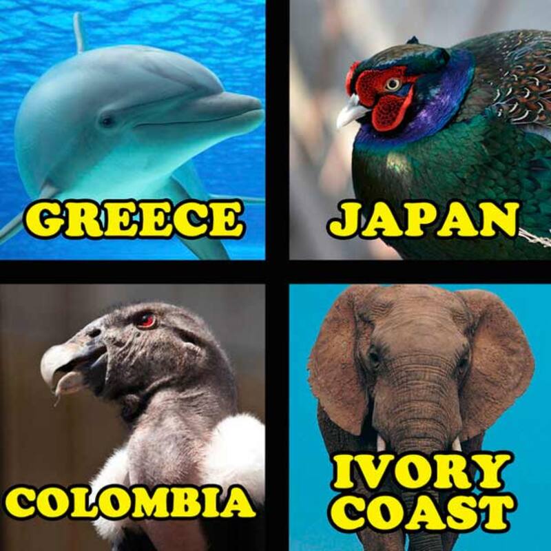 El cóndor de Colombia y el elefante de Costa de Marfil no tienen rivales en el faisán verde de Japón y los delfines de Grecia.