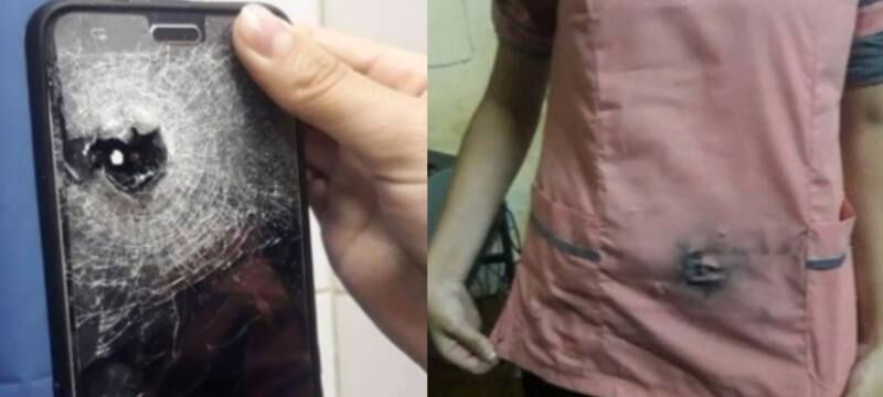 La joven puso resistencia al hecho, a lo que el delincuente le disparo en el estómago. A pesar de esto la víctima logró salir solo con un rasguño ya que la bala impactó en el teléfono que la joven tenía en el bolsillo delantero del delantal, sí, el mismo aparato que le intentaron quitar y ella escondió ahí.