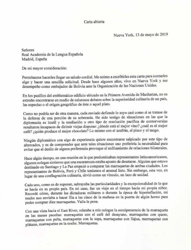 Luego, ante la prensa, relató que "el motivo de esta carta es que tengan a bien incluir a Bolivia en el apartado en el que el diccionario se refiere a la marraqueta (…) Sé que les resultará muy sencillo hacerlo.