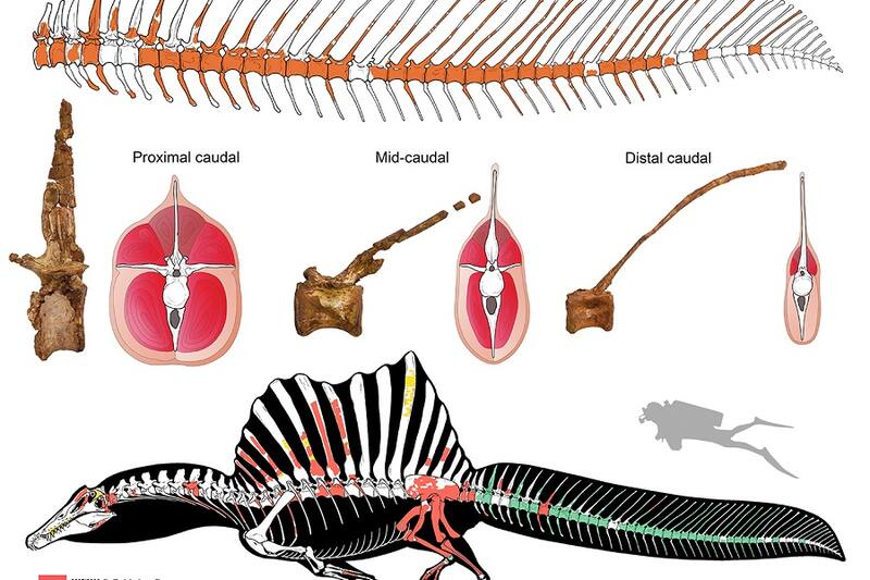 Científicos han presentado pruebas que creen inequívocas de que Spinosaurus aegyptiacus, el dinosaurio depredador más largo conocido por la ciencia, era acuático y utilizaba la locomoción de natación con propulsión de cola para cazar presas en un sistema fluvial masivo. Es la primera vez que tal adaptación se ha informado en un dinosaurio.