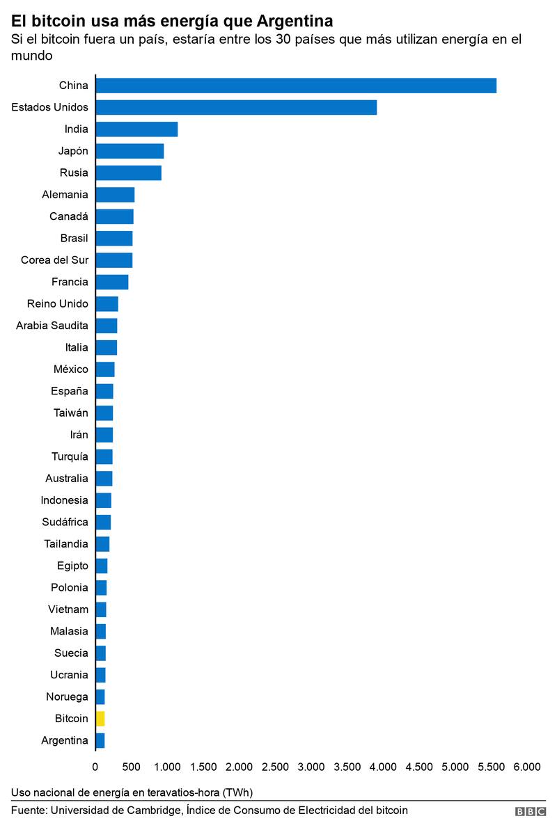Si el bitcoin fuera un país, consumiría más electricidad al año que Finlandia, Suiza o Argentina, según un análisis del Centro de Finanzas Alternativas de la Universidad de Cambridge.