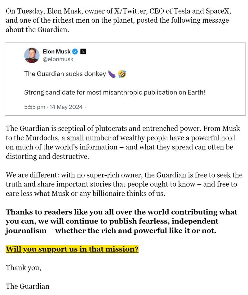 Como respuesta a ese post, el magnate redactó una ofensa dirigida a The Guardian y agregó que es un “fuerte candidato a la publicación más misantrópica de la Tierra”.
