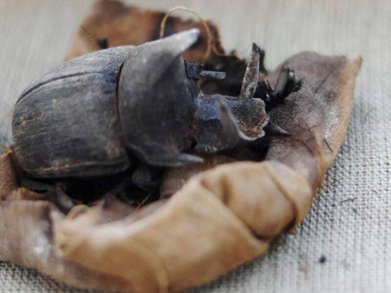 Dos grandes escarabajos momificados fueron descubiertos al interior de una tumba rectangular en piedra calcárea, precisó. También se descubrió otra colección de escarabajos adentro de una tumba cuadrada, en piedra caliza con un escarabajo pintado en negro.