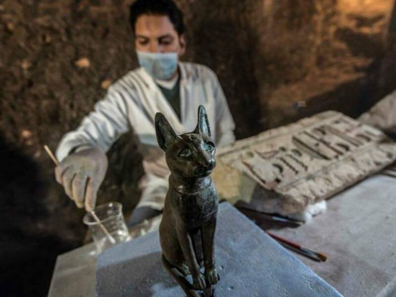 Además se descubrieron decenas de gatos momificados al igual que 100 estatuas de gatos en madera dorada y una estatua de bronce, dedicados a la diosa gata Bastet.
