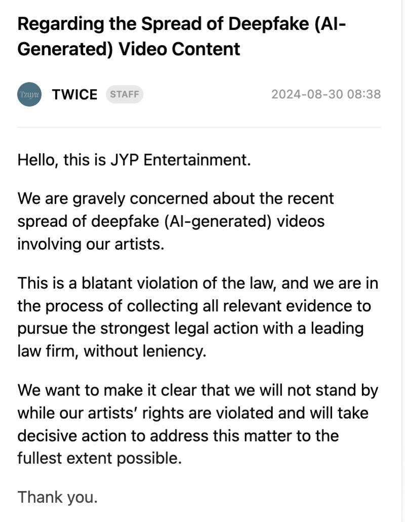 Es más, recientemente JYP Entertainment anunció acciones legales contra la distribución de deepfakes explícitos de sus artistas: “Esto es una violación flagrante de la ley y estamos en el proceso de recopilar todas las pruebas pertinentes para emprender duras acciones legales con abogados, sin indulgencias”.