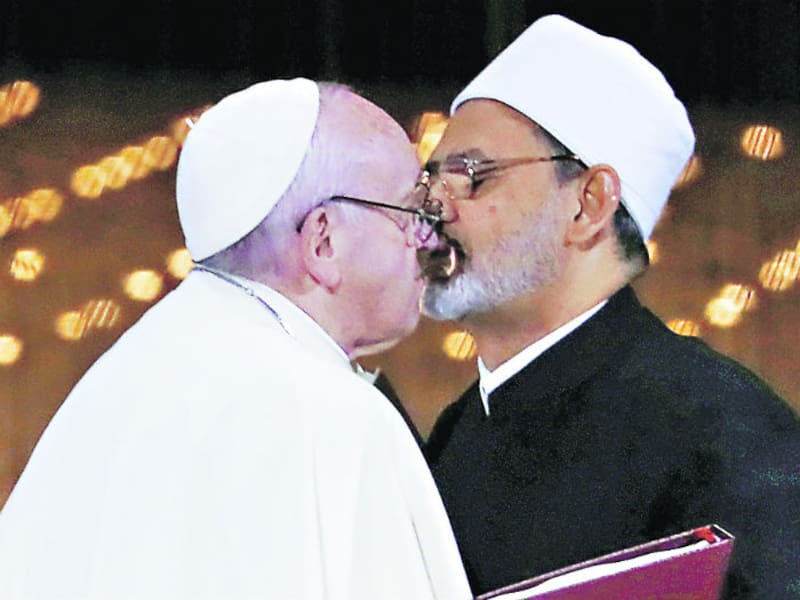 Durante todo el día, el Papa, vestido de blanco, y el gran imán sunita del instituto egipcio Al Azhar, el jeque Ahmed al-Tayeb, de negro, se mostraron juntos frente a la gran Mezquita Zayed -una de las más grandes del planeta. Luego se besaron en la tribuna de la conferencia interreligiosa, bañada por una lluvia de hojas de olivo.