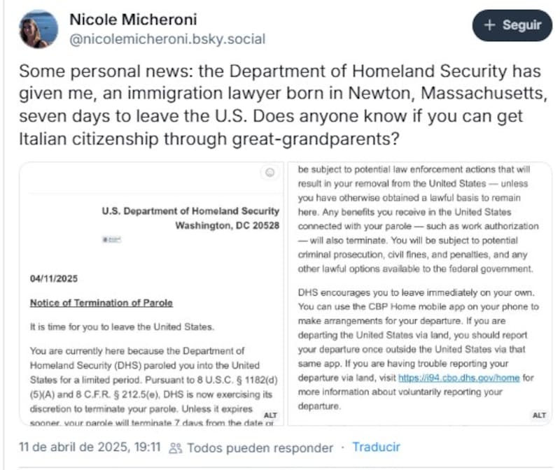 La profesional no podía creer el correo que llegó a su casilla: “El Departamento de Seguridad Nacional me ha dado a mí, una abogada de inmigración nacida en Newton, Massachusetts, siete días para salir de Estados Unidos”, denunció a través de la red social Bluesky.