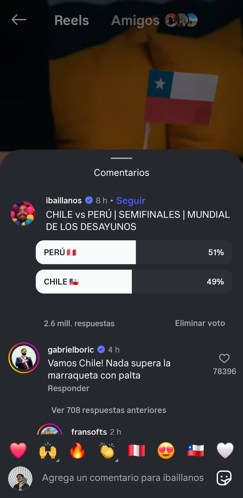 En el caso de Chile, fue el propio presidente Gabriel Boric, quien subió un comentario a través de su cuenta de Instagram que dice “¡Vamos Chile! Nada supera la marraqueta con palta“, mostrando un verdadero interés gubernamental para que Chile avance a la final del torneo.