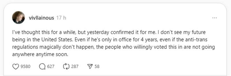 “Incluso si solo está en el cargo por 4 años. Incluso si las regulaciones anti-trans mágicamente no ocurrieran, la gente que conscientemente votó por él no va a desaparecer de repente”, expresó la joven.