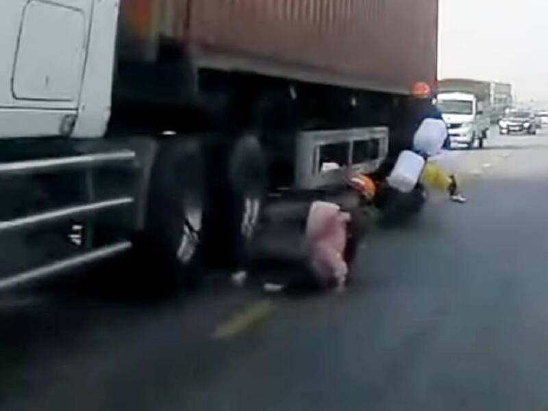 Un video registró el asombroso momento en que una madre salvó a su pequeño hijo de ser aplastado por las ruedas un camión después de que ambos resbalaran desde una motocicleta.