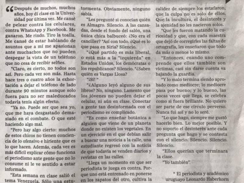 «Esta semana en clase salió el tema de Venezuela. Solo una estudiante entre veinte pudo decir lo básico del conflicto. Les pregunté: ¿Qué es lo que pasa en Siria? Silencio. ¿Qué partido es más liberal o está más a la 'izquierda' en Estados Unidos, los demócratas o los republicanos? Silencio»