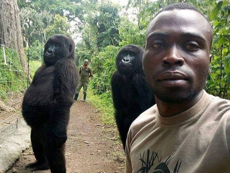 Una divertida foto de dos gorilas posando como personas junto a un guarda forestal llamado Patrick Sadiki se está convirtiendo en la sensación de internet.