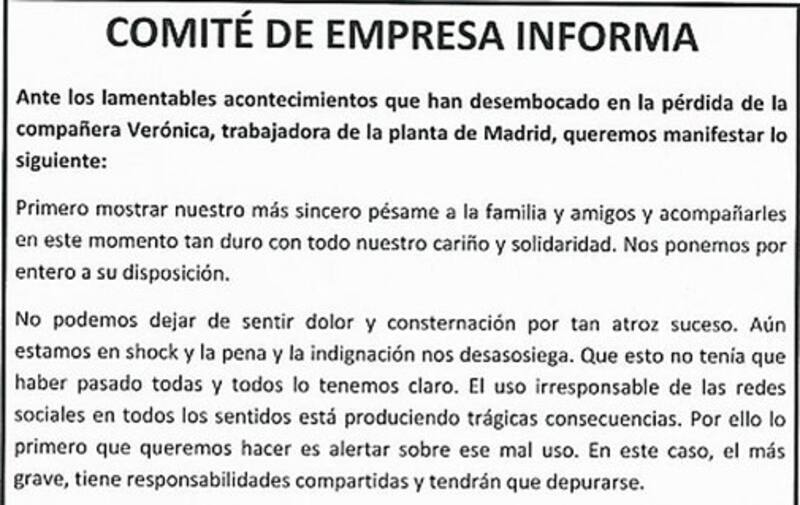 Según indicó uno de los compañeros de la víctima al diario El Mundo, "había miradas, gente que iba a verla al lugar de trabajo para ver quién era, sintió mucha presión, habló incluso con Recursos Humanos. Cuando su marido se enteró se le cayó el mundo y fue un poco responsabilidad de todos".