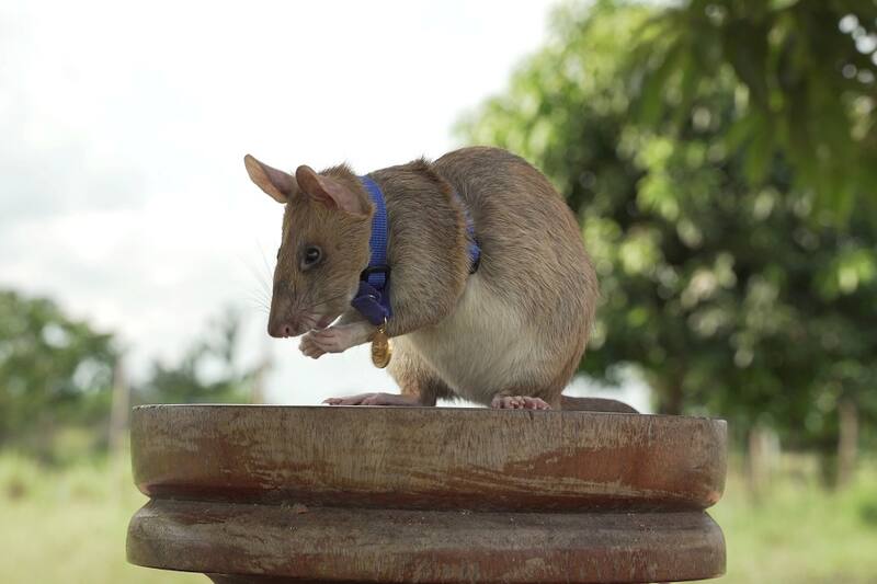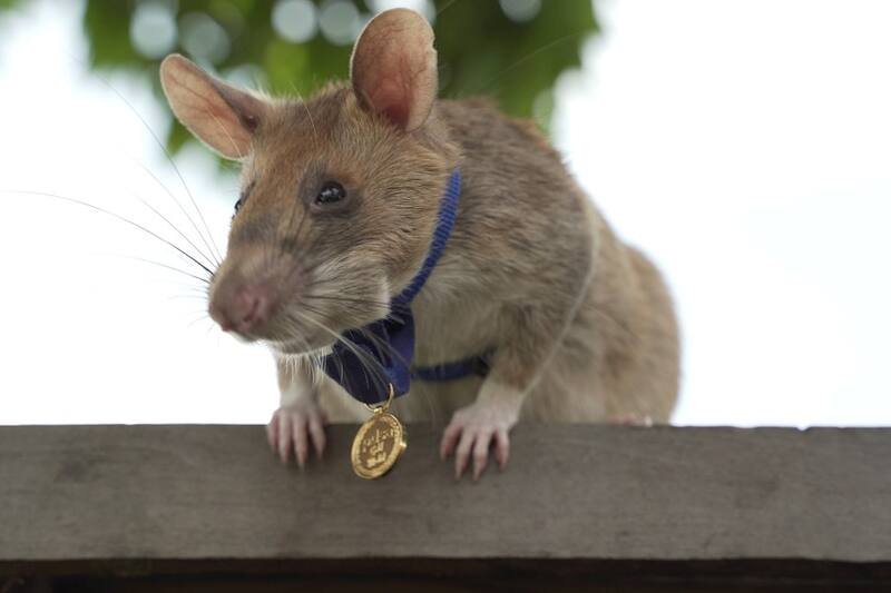 La Asociación Veterinaria Británica PSDA galardonó a la rata gigante africana que detecta minas antipersonas en Camboya. El roedor recibió una versión en miniatura de su medalla de oro.