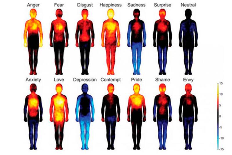 Por ejemplo, la investigación mostró que "el sentimiento de felicidad abarca casi todo el cuerpo, y es muy similar al amor. El orgullo y la ira son prácticamente iguales, lo mismo que el miedo, la ansiedad y el asco".