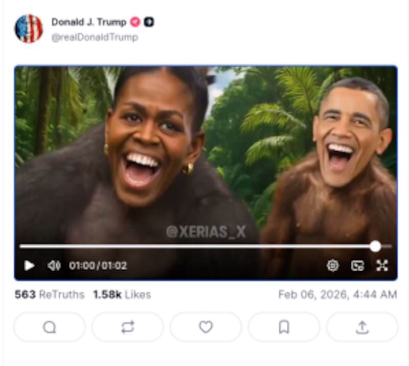 El material, aparentemente creado con inteligencia artificial, incluye una breve escena en la que Barack y Michelle Obama aparecen caracterizados como simios, lo que provocó acusaciones de racismo en contra del primer mandatario.