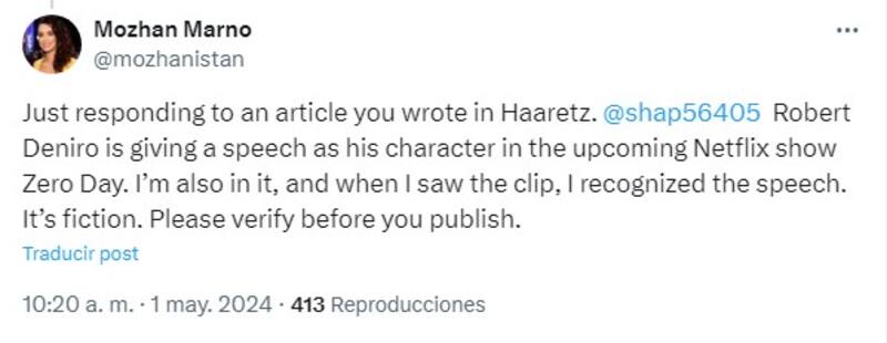 “Robert Deniro daba un discurso como su personaje enla próxima serie de Netflix, Zero Day. Yo también estoy en ella y cuando vi el clip, reconocí el discurso. Es ficción. Verifique antes de publicar”, descargó.