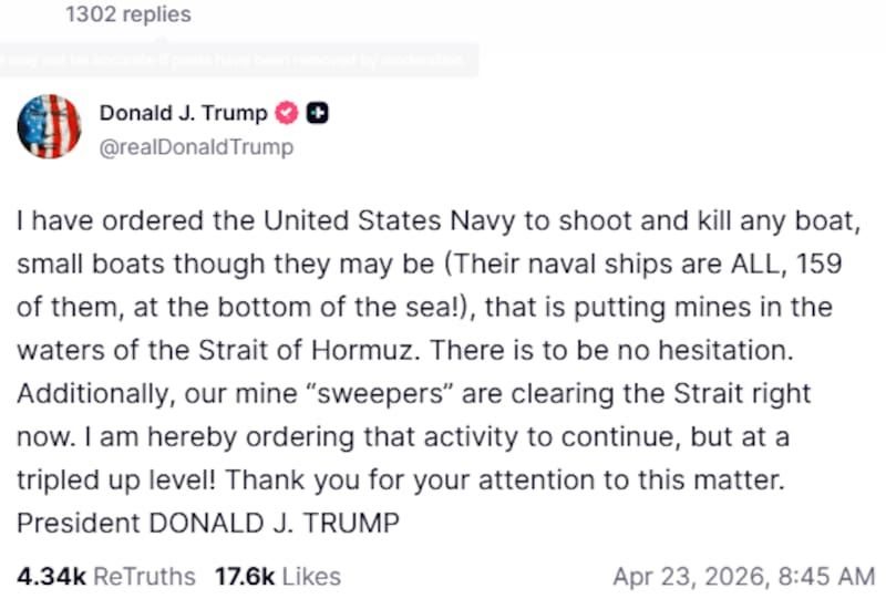 El presidente Donald Trump dio la orden a la Marina de Estados Unidos de abrir fuego y destruir cualquier embarcación que instalen minas navales en el estrecho de Ormuz.