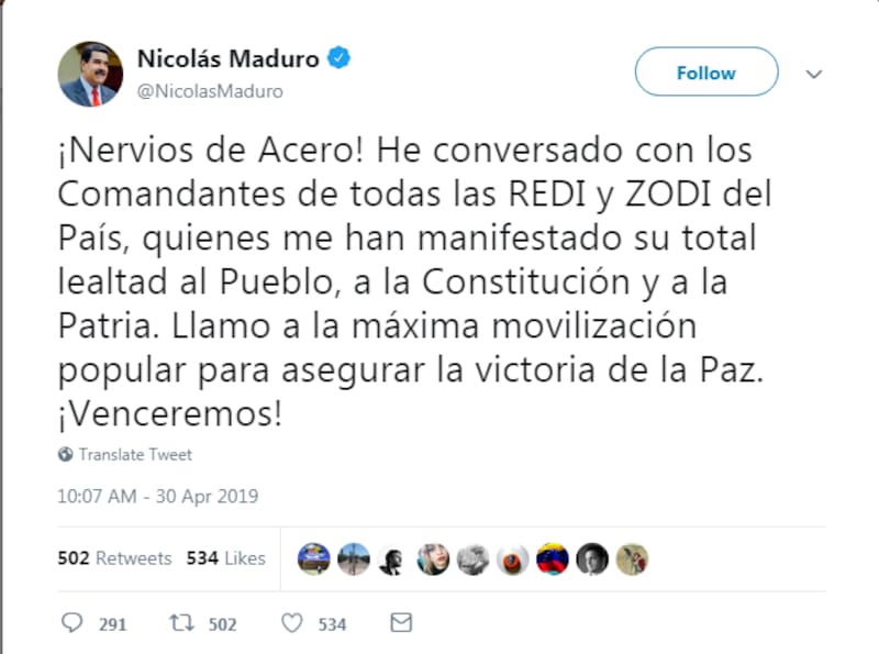 "¡Nervios de Acero! He conversado con los Comandantes de todas las REDI y ZODI del País, quienes me han manifestado su total lealtad al Pueblo, a la Constitución y a la Patria. Llamo a la máxima movilización popular para asegurar la victoria de la Paz. ¡Venceremos!", dijo Maduro en su cuenta de Twitter.