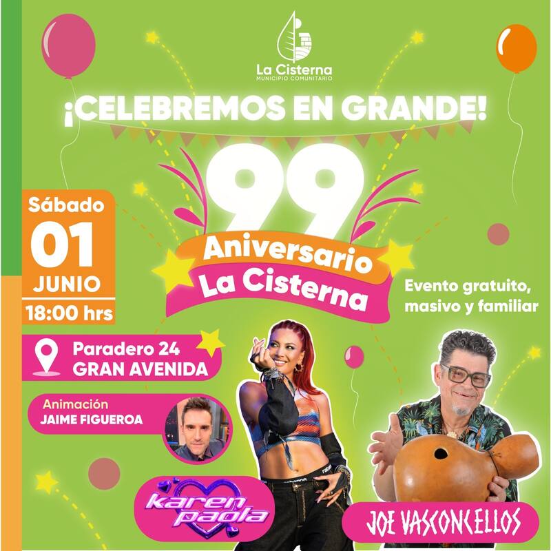 Este sábado 01 de junio, la comuna de La Cisterna celebra su aniversario número 99. La cita es a las 18:00 horas y contará con la presentación en vivo de grandes artistas.