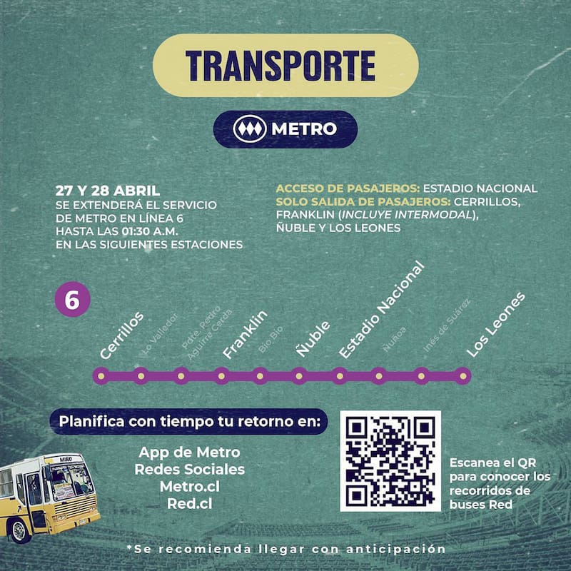 Los recorridos en los que habrá buses de apoyo este sábado 27 y domingo 28 de abril, por los conciertos de Los Bunkers, son los siguientes: