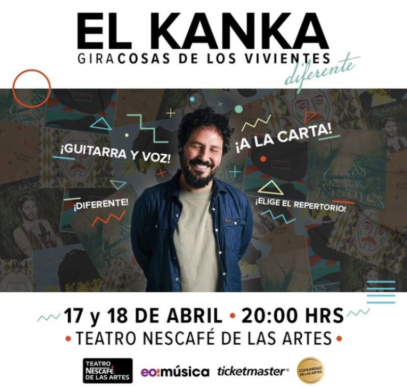 Con una presencia cada vez más amplia en nuestro país, el cantante español, El Kanka, regresa a Chile para ofrecer tres esperados conciertos los días 17 y 18 de abril en el Teatro Nescafé de las Artes en Santiago, 19 de abril en La Bodeguita de Nicanor en Concepción y 20 de abril en Trotamundos Quilpué.
