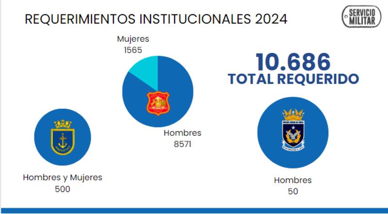 Para el año 2024, las Fuerzas Armadas requieren un total de 10.686 jóvenes, entre hombres y mujeres, para completar el contingente de soldados conscriptos. En la imagen de abajo el detalle.