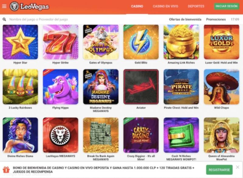 LeoVegas es una web que combina salas de casino de los mejores proveedores y la mejor cobertura de eventos deportivos. Se trata de una plataforma estable para jugadores chilenos, en la que se puede reclamar una oferta de hasta $850.000 CLP y 50 giros de regalo a través del bono de bienvenida.