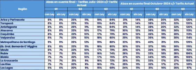 Para aquellos que pagan hoy un valor menor de $45.000 en sus cuentas, estos podría sufrir un alza de hasta un 15%. Asimismo, los que pagan entre $45.000 y $65.000 en sus cuentas, van a tener un aumento que puede llegar hasta el 35%; y los que pagan más de $65.000, el alza será cerca de un 30%.