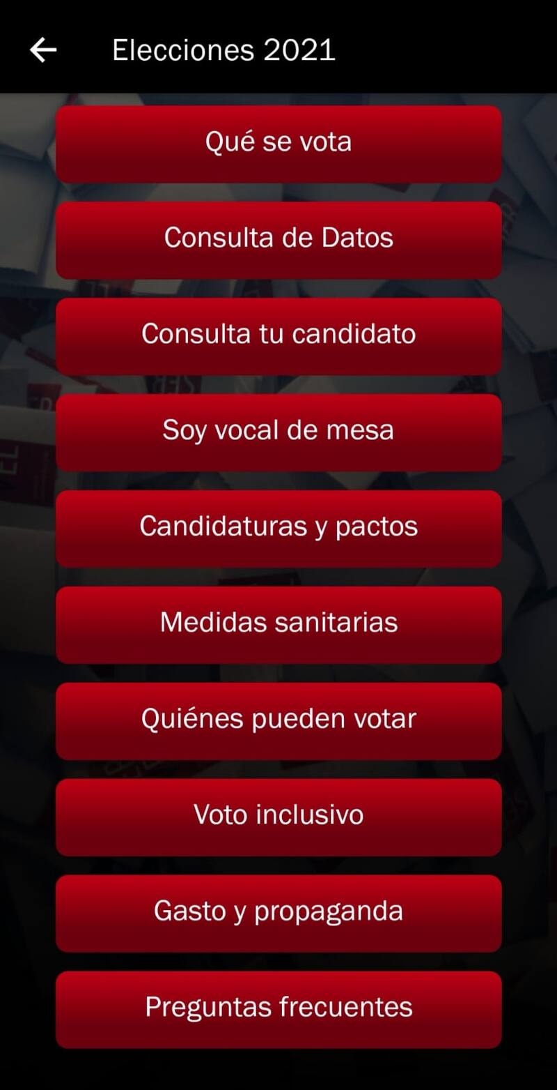 Al pinchar el círculo junto a cada candidata/o se podrá acceder también a sus programas (en el caso de presidenciales), números, pactos y letras, si corresponde.
