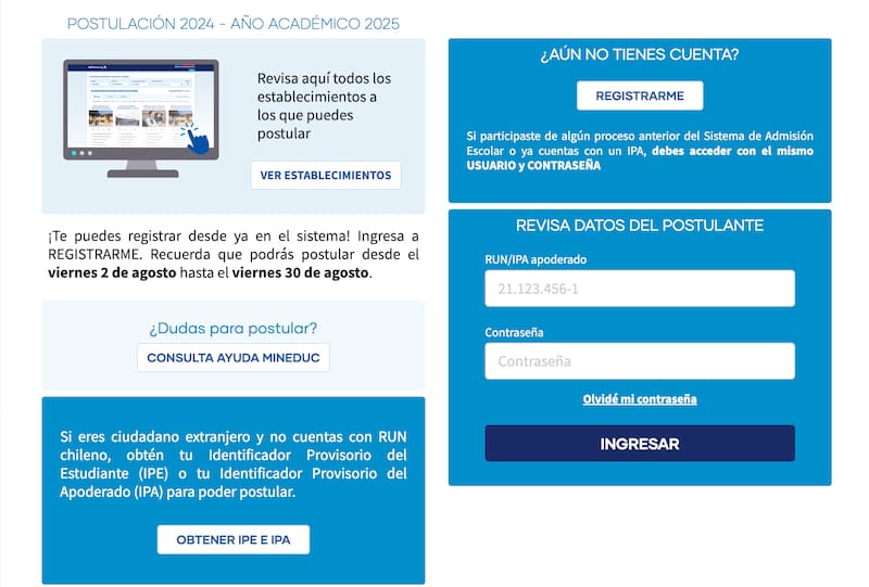 Según se informa a través del sitio web oficial del Sistema de Admisión Escolar, el primer periodo de postulación a establecimientos educacionales comienza este viernes 2 de agosto, cuyos resultados podrán conocerse a partir del próximo 17 y 23 de octubre.