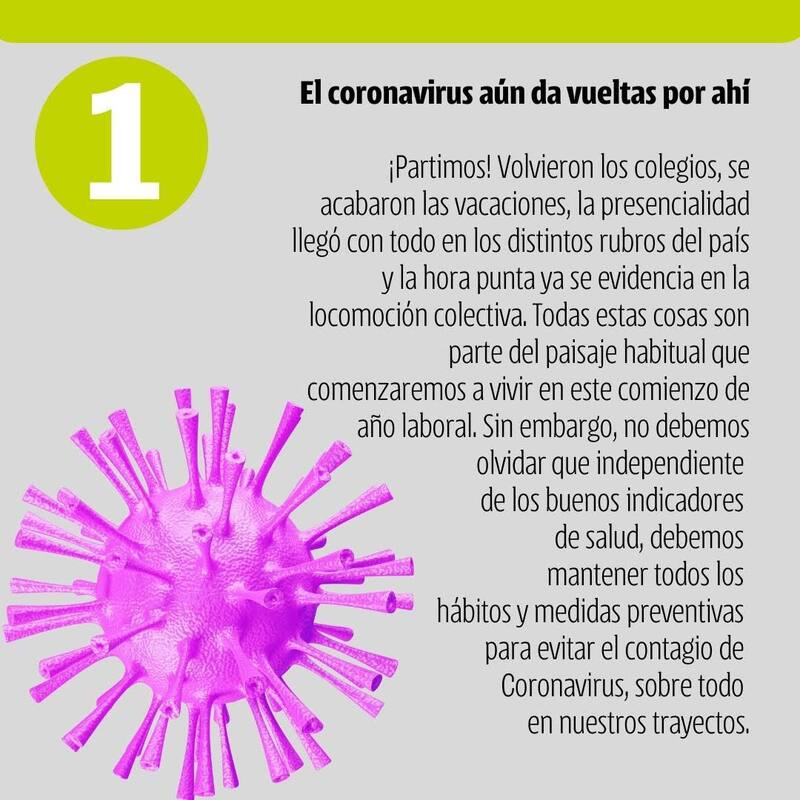 * ¡Partimos! Volvieron los colegios, se acabaron las vacaciones, la presencialidad llegó con todo en los distintos rubros del país y la hora punta ya se evidencia en la locomoción colectiva. Todas estas cosas son parte del paisaje habitual que comenzaremos a vivir en este comienzo de año laboral. Sin embargo, no debemos olvidar que independiente de los buenos indicadores de salud, debemos mantener todos los hábitos y medidas preventivas para evitar el contagio de Coronavirus, sobre todo en nuestros trayectos.