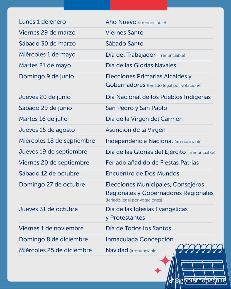 A pocos días de terminar el año, y a través de TikTok, el Gobierno de Chile compartió un video con el detalle de todos los feriados que vienen este 2024.