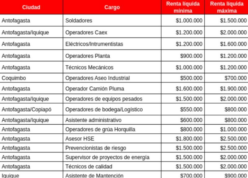 Respecto al sueldo, explicaron que las remuneraciones “varían según el cargo y oscilan entre los $500 mil y $2,5 millones”. Siendo las más altas, ofertas para asesores HSE, prevencionistas de riesgos, supervisores de proyectos de energía y técnicos de calidad.