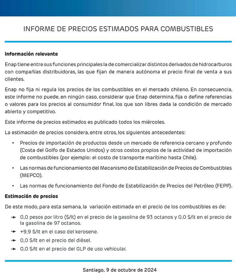 En este contexto de variación de valores, Enap destacó que “no fija ni regula los precios en el mercado chileno”, en donde se toma en consideración antecedentes de la importación de productos (Costa del Golfo de Estados Unidos), el funcionamiento del Mecanismo de Estabilización de Precios de Combustibles (MEPCO) y del Fondo de Estabilización de Precios del Petróleo (FEPP).