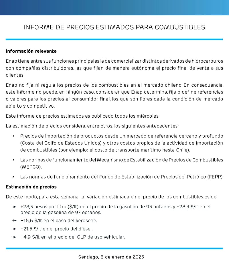 En este contexto de variación de valores, Enap destacó que “no fija ni regula los precios en el mercado chileno”, en donde se toma en consideración antecedentes de la importación de productos (Costa del Golfo de Estados Unidos), el funcionamiento del Mecanismo de Estabilización de Precios de Combustibles (MEPCO) y del Fondo de Estabilización de Precios del Petróleo (FEPP).