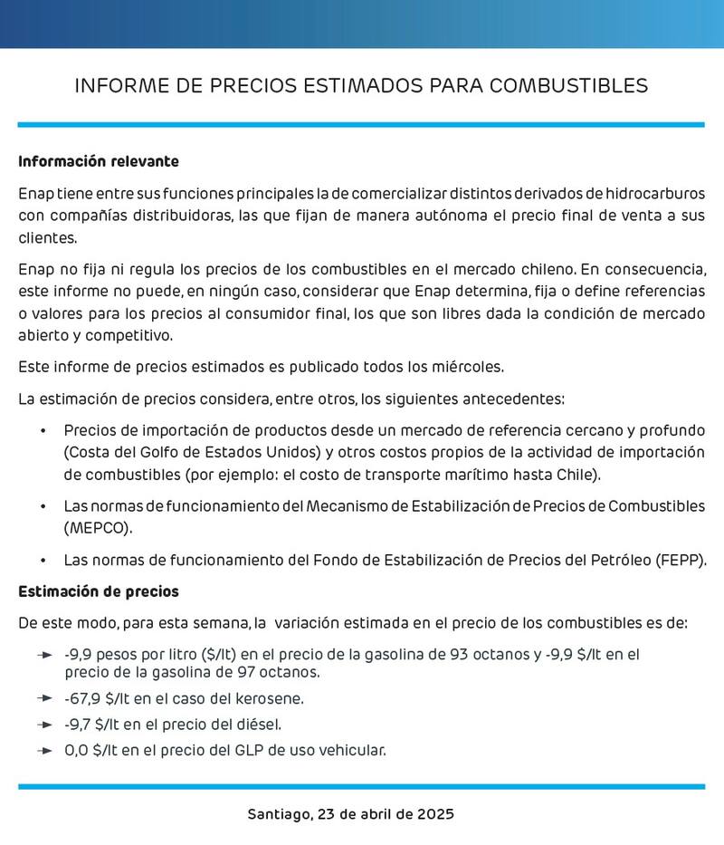 Durante este miércoles, la Empresa Nacional del Petróleo (Enap) entregó un nuevo informe sobre la variación de precios en combustibles, instancia en la que a partir de este jueves 24 de abril se refleja una baja en el precio de la gasolina y la parafina.