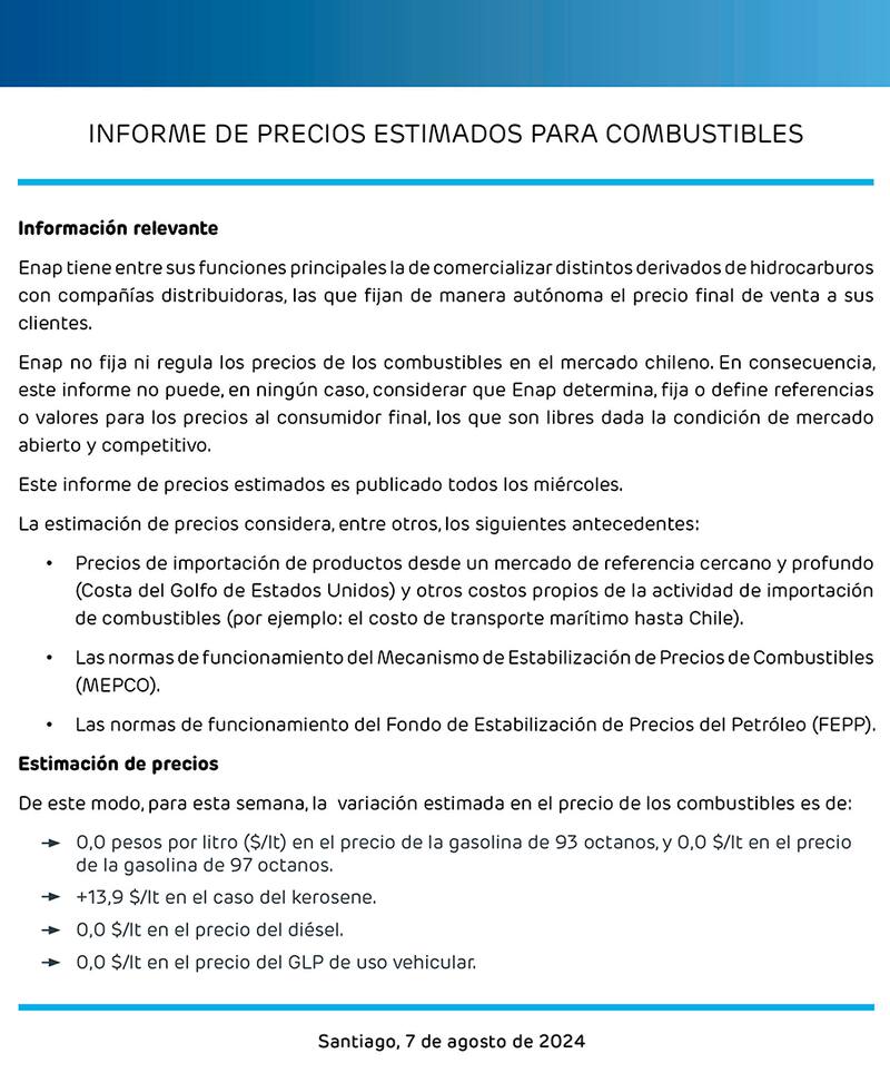 En este contexto de variación de valores, Enap destacó que “no fija ni regula los precios en el mercado chileno”, en donde se toma en consideración antecedentes de la importación de productos (Costa del Golfo de Estados Unidos), el funcionamiento del Mecanismo de Estabilización de Precios de Combustibles (MEPCO) y del Fondo de Estabilización de Precios del Petróleo (FEPP).