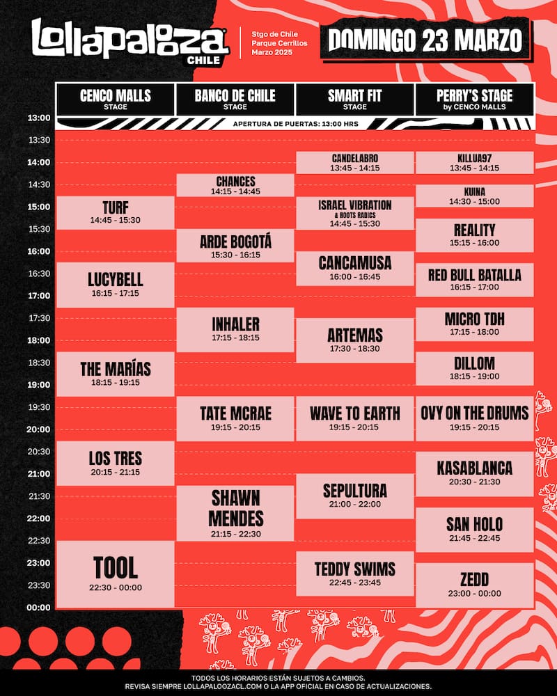 Asimismo, este año cambia un poco el panorama con la apertura de puertas. Según lo informado, el próximo 21, 22 y 23 de marzo, el Parque Bicentenario Cerrillos abrirá sus puertas a los fans de Lollapalooza a las 13:00 horas, momento en el que se espera que se espera que las primeras bandas y artistas comiencen a presentarse a eso de las 13:45 horas.