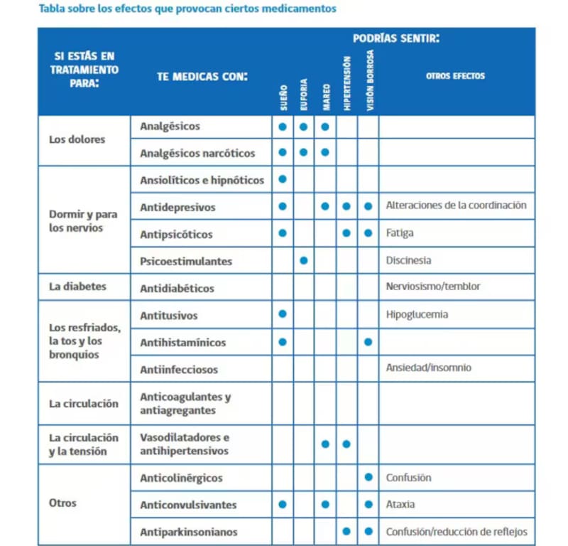 El manual además diferencia entre antihistamínicos y psicofármacos, por el tipo de efectos. Mientras que los primeros implican un riesgo porque “conducir bajo los efectos de algunos de estos medicamentos es equivalente al riesgo de conducir con una asa de alcohol en la sangre de 0,5 g/l a 0,8 g/l”. Mientas, los segundos pueden generar alteraciones en las habilidades para “una conducción segura”.
