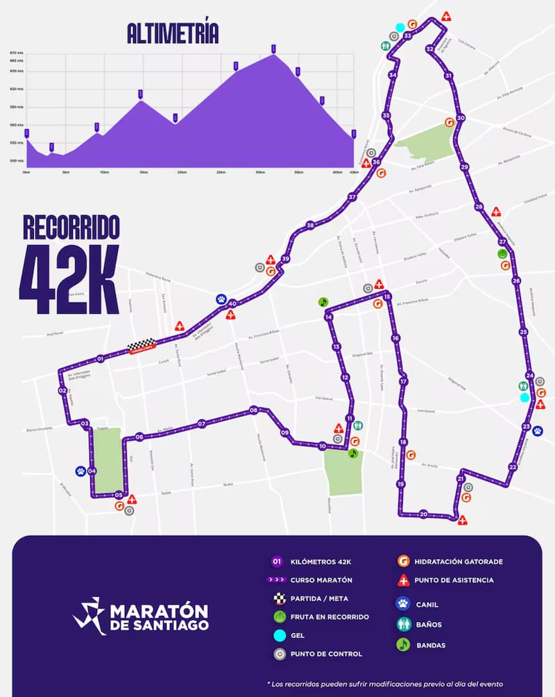 Con un recorrido total de 42 kilómetros, los participantes y aficionados al deporte podrán elegir entre tres circuitos: el maratón completo, el medio maratón (21K) y la corrida de Santiago (10K).